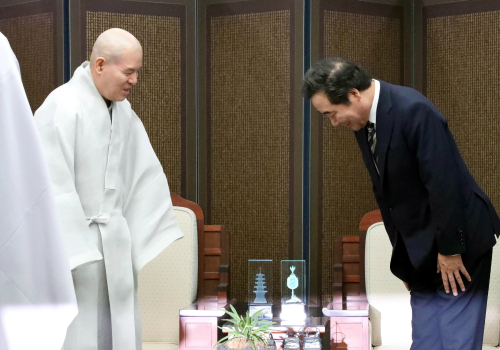 | 이낙연 국무총리(오른쪽)가 7일 오후 조계종 총무원장 자승 스님을 만나 고개를 숙여 인사하고 있다. 연합뉴스 |