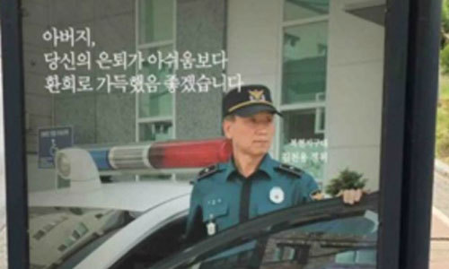 광고판엔 "아버지, 당신의 은퇴가 아쉬움보다 환희로 가득했으면 좋겠습니다", "30여 년간 묵묵히 사회와 가정을 지켜온 당신의 헌신과 노고에 경의를 표합니다", "여기 한 남자의 미래를 응원해주세요"라는 문구가 경찰제복을 입고 있는 중년의 경찰관 모습과 함께 담겨 있다 .