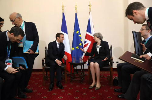 | 대화를 나누고 있는 에마뉘엘 마크롱 프랑스 대통령(왼쪽)과 테리사 메이 영국 총리. 출처=게티이미지 |