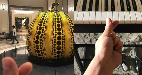 공개된 사진 속 그는 손가락으로 하트모양을 만들어 사진을 찍고 있다.