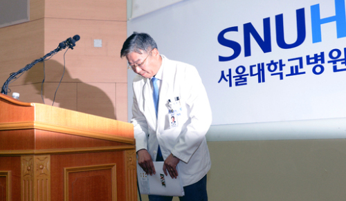 | 고개 숙인 서울대병원 15일 서울 종로구 서울대학교병원에서 열린 ‘고(故) 백남기 농민 사망진단서 사망의 종류 수정 기자회견’에서 김연수 서울대병원 진료부원장이 발표에 앞서 인사를 하고 있다. 서울대병원은 이날 지난해 9월 ‘병사’로 발표해 논란을 빚었던 백씨의 사인을 ‘외인사’로 변경했다. 남정탁 기자 |