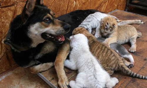 과거에도 중국 헤이룽장(黑龍江) 성과 저장(浙江) 성 등의 동물원에서도 새끼 호랑이들에게 젖 먹이는 어미 개 사진이 공개돼 화제가 된 바 있다.