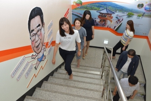 21일 달성군청에 따르면, 청사 1층에서 9층을 오르내리는 건강 계단은 지역의 9개 읍·면 관광지와 특산물을 테마로 하고 있다.