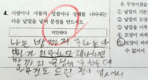 아빠를 감동시킨 문제는 ‘미안하다’는 낱말을 넣어 문장을 완성하는 것이었다. 아이는 이 답란에 “나는 밤까지 일하는 아빠가(에게) 미안하다. 왜냐하면 밤까지 열심히 일하는 데 아무것도 드린 적이 없어서…”라고 적었다. 선생님은 아이의 답에 빨간색으로 커다랗게 동그라미를 그려줬다.
