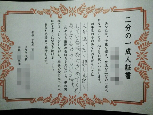 | 1/2 성인식. 부모는 10살이 된 아이들을 축하하며, 아이들은 부모에 대한 감사를 전한다. 지역과 학교에 따라 시기는 조금씩 다르지만 보통 어머니의 날, 아버지의 날이 있는 5월에 진행된다. |
