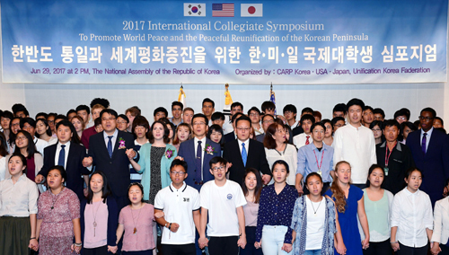 | 29일 서울 여의도 국회도서관에서 열린 ‘한반도 통일과 세계평화 증진을 위한 한·미·일 국제대학생 심포지엄’에서 송광석 남북통일운동국민연합 회장과 한·미·일 대학생들이 손잡고 ‘우리의 소원’을 노래부르고 있다. 이재문 기자 |