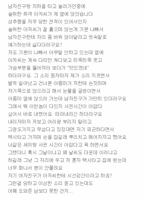 술에 취한 중년 남성이 탑승해 A씨의 옆자리에 앉더니 음흉한 눈빛으로 A씨를 훑어본 것.
