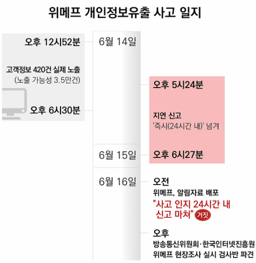 이런 상황에서 위메프는 정보유출 사실을 인지하고서 해당 내용을 관계 기관에 제때 알리지 않았다는 비난을 받고 있다. 위메프는 지난달 14일 오후 5시 24분 정보유출 사실을 인지한 후 약 25시간이 지난 이튿날 오후 6시 27분에서야 겨우 1차 신고를 마쳤다. 정통망법에 따라 3000만원의 과태료가 부과되는 사안이다.