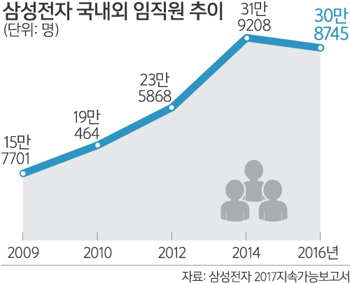 국내 인력이 9만3204명으로 3.8% 줄었고, 해외인력이 5.8% 감소한 21만5541명으로 집계됐다. 삼성전자는 2011년부터 해외인력 숫자가 국내 인력을 추월했다.