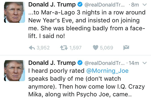 트럼프는 최근 MSNBC 여성 앵커 미카 브래진스키에게 막말을 퍼붓는 트윗을 날려 파문을 일으켰다. 트럼프는 “IQ 낮은 미친 미카는 성형수술로 피를 철철 흘리고 있었다”고 인신공격을 퍼부었다. 트럼프는 자신을 공격하는 사람에게는 ‘되로 받고 말로 갚는’ 보복을 철칙으로 지키고 있다. 그는 상대방을 공격할 때 항상 IQ 문제를 걸고 넘어진다.