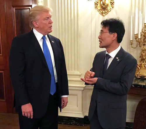 | 3일 문재인 대통령의 방미 당시 장하성 정책실장이 트럼프 미국 대통령과 대화 중인 모습. 연합뉴스 |