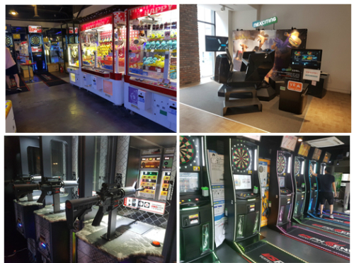 | 대형 오락실에서 볼 수 있는 다양한 게임기. 위쪽 왼쪽부터 시계 방향으로 인형뽑기, 가상현실(VR) 게임기, 다트, 사격. |