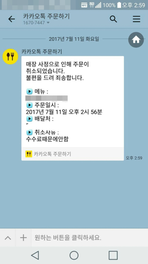 11일 한 온라인 커뮤니티에는 "BBQ 시켰는데 취소 사유 미쳤다"라는 제목으로 '카카오톡 주문하기' 캡처 사진이 올라왔다. 사진에는 "매장 사정으로 인해 주문이 취소됐다. 불편을 드려 죄송하다"는 문구와 함께 취소 사유로 "수수료 때문에 안 함"이라고 적혀있었다.