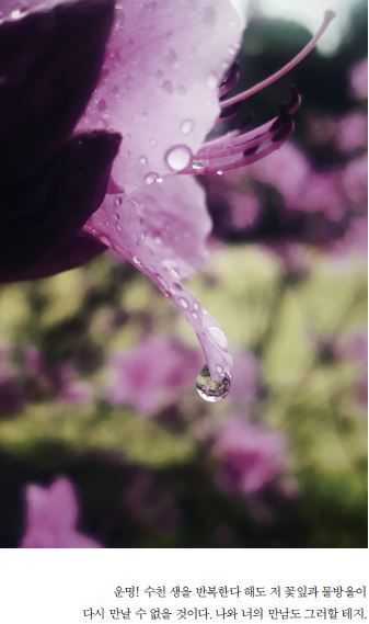 일기일회(一期一會)의 말처럼 사진속의 철쭉 꽃잎과 물방울의 만남은 일생에 단 한 번뿐입니다. 수천 생을 거듭한다 해도 둘은 다시 만날 수 없을 겁니다. 철쭉에 물방울이 다시 맺힐지라도 물방울은 이미 그 물방울이 아니고 철쭉의 꽃잎도 똑같은 모습이 아니기 때문이죠.