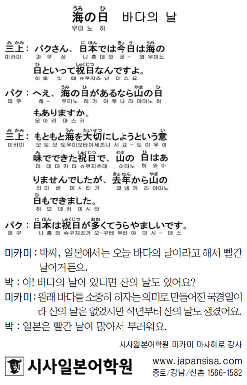 [시사일본어학원의 초단기 일본어 회화] 바다의 날 입력 : 2017-07-17 09:00:00 수정 : 2017-07-16 20:50:40 구글 네이버 유튜브 Copyright ⓒ 세계일보. 무단 전재 및 재배포 금지 세계일보 조선미