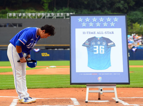 | 이승엽이 15일 대구 삼성 라이온즈 파크에서 열린 올스타전 유니폼 헌정 행사에서 팬들에게 인사하고 있다. 연합뉴스 |