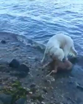 | 바다에 뛰어 들어가 어린 사슴의 목을 물어 구조해 낸 골든 리트리버가 사슴의 상태를 살피고 있다. |