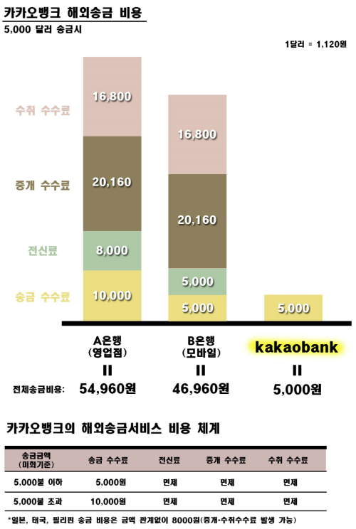 카카오뱅크는 5000달러 이하 송금시 총 비용은 5000원, 5000달러 초과시에는 1만원이다. 카카오뱅크는 전신료, 중개수수료, 수취수수료를 면제할 계획이다. 단, 일본, 태국, 필리핀은 금액에 관계없이 8000원이며 중개수수료와 수취수수료가 발생할 수 있다.