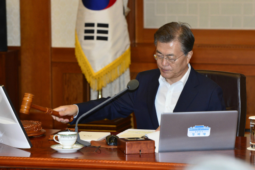 | 문재인 대통령이 25일 청와대에서 취임 후 세번째로 국무회의를 주재하면서 의사봉을 두드리고 있다. 이번 국무회의에는 처음으로 새 정부가 임명한 국무위원들만 참석했다. 청와대 사진기자단 |