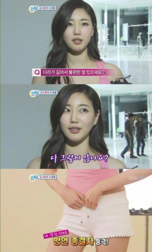 | 배우 김사랑이 2011년 SBS '한밤의 TV연예'와 인터뷰를 통해 다리가 길어 생활에 불편한 점을 털어넣고 있다. 사진=SBS 캡처 |