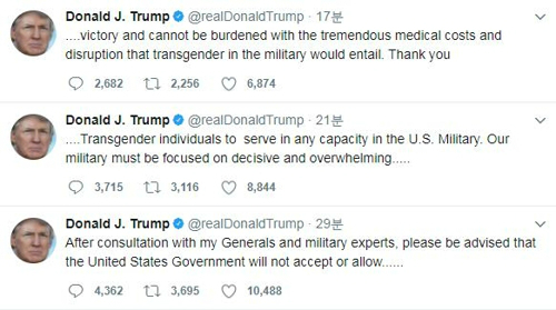 트럼프 미국 대통령이 트랜스젠더의 군 복무 금지에 관한 견해를 밝힌 트윗 글. 트위터 캡처