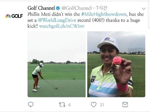 미국 골프 전문 매체 골프다이제스트는 "미국 콜로라도주 덴버에서 열린 월드 롱드라이브 챔피언십 여자부 준결승에서 메티가 406야드를 날려 이 부문 세계 기록을 수립했다"고 27일 보도했다.