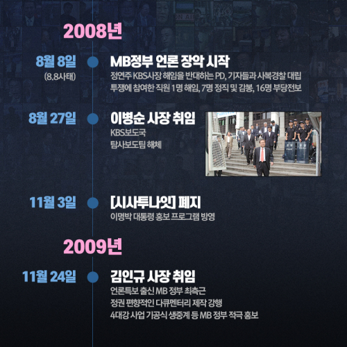 인포그래픽은 2008년부터 2017년 현재까지 MBC와 KBS 두 공영방송이 몰락한 과정과 공범자들의 만행, 언론인들의 저항 등 내용을 확인할 수 있다.