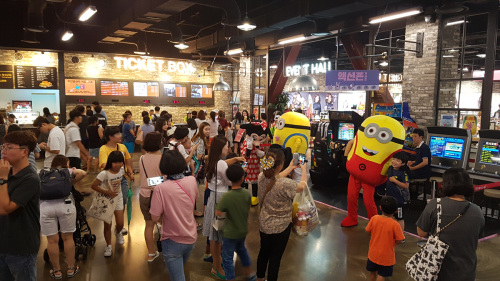| 야우리시네마 티켓박스 앞에서 영화속 주인공 캐릭터들이 돌아다니며 관객들과 사진을 찍고 있다. 야우리시네마 제공. |