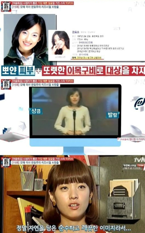 | 한효주가 과거 tvN '명단공개'에서 '시청자가 뽑은 가장 예쁜 얼굴을 가진 스타' 15위를 차지했다. 이에 명단공개 측은 한효주의 앳된 시절 방송 출연분을 모아 시청자를 사로잡았다. 사진=tvN 캡처 |