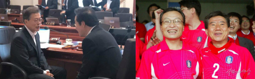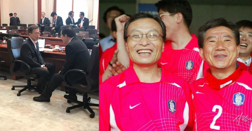 | 지난 8일 국무회의가 열린 청와대 세종실에서 문재인 대통령과 이낙연 총리가 무릎을 맞댄 채 이야기를 하고 있다.(왼쪽 사진), 2002년 6월10일 대구 월드컵경기장에서 어깨동무를 한 채 한국과 미국의 조별리그 경기에서 대표팀을 응원하고 있는 노무현 전 대통령과 이해찬 전 총리. 사진=청와대· 노무현재단 제공 |
