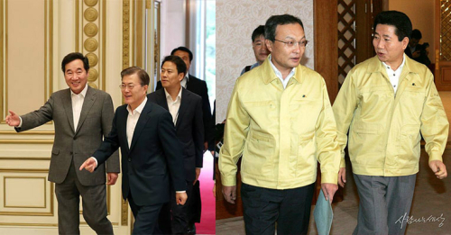 | 지난달 20일 청와대 영빈관에서 열린 '2017 국가재정전략회의'에 참석한 문재인 대통령을 반걸음 뒤에서 안내하고 있는 이낙연 총리(왼쪽 사진), 2005년 8월22일 을지국무회의장을 노무현 대통령과 나란히 들어서고 있는 이해찬 총리의 모습. 사진=청와대· 노무현재단 제공 |