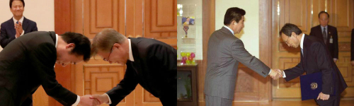 | 문재인 대통령은 지난 5월31일 청와대에서 이낙연 총리에게 임명장을 수여 서로 고개 숙여 인사하며 악수를 하고 있다.(왼쪽 사진). 지난 2004년 6월30일 노무현 대통령이 이해찬 총리에게 임명장을 수여한 뒤 악수를 나누고 있다. |