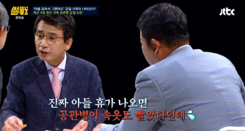 지난 10일 JTBC '썰전'에서 '공관병 갑질'문제를 다루면서 김구라가 박 대장의 부인이 "아들같이 생각해서 그랬다라는 해명을 했다"고 말하자 유 작가는 "자기 아들 같아서 그랬다니, 똑같은 아들인데 콩쥐, 팥쥐 엄마야 뭐야"라며 "진짜 아들이 나오면 공관병이 (박 대장 아들의)속옷까지 빨았다"고 흥분했다.