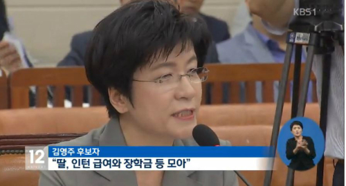 | 11일 열린 인사청문회에서 김영주 고용노동부장관 후보자는 2억5500만원에 이르는 딸의 재산증식에 대해 "세뱃돈, 조교 급여, 장학금 등으로 마련했다"라는 설명을 하고 있다. KBS TV 캡처 |