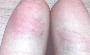 | 서울의 사립 S고교에서 한 여교사가 신문지를 여러 겹 촘촘히 말아 만든 막대기로 남학생의 허벅지 등을 수십 대 때려 피해 학생의 체벌 부위에 붉은 피멍이 생긴 모습. 서울시교육청 학생인권교육센터 제공 |