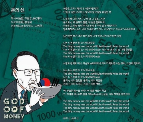 공개된 가사를 보면 “늬들은 고작 사람이나 사랑 따윌 믿지? 난 돈을 믿어”, “나는 나는 돈의 신, 오 나의 개돼지” 등 독설에 가까운 가사로 MB를 비난했는데 이러한 가사들 때문에 정치적 입장이 다른 누리꾼들이 설전을 벌이고 있다.
