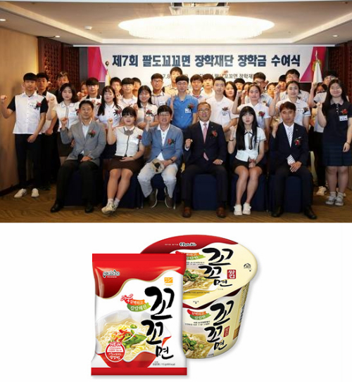 | 팔도꼬꼬면 장학재단이 지난 22일 부산에서 진행한 장학금 수여식(위), 꼬꼬면 제품 사진(아래). 사진=팔도 |