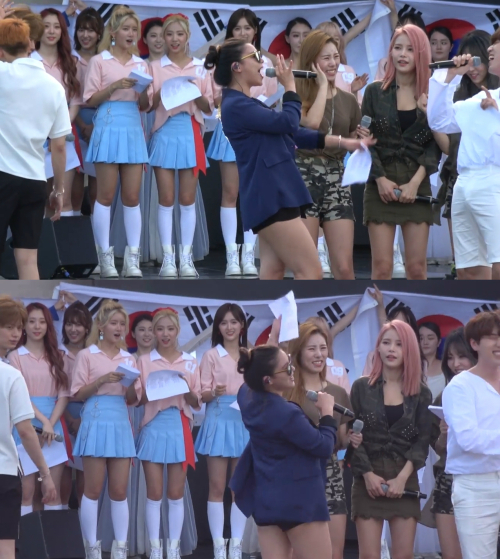 | 지난 12일 경기도 파주시에서 열린 '2017 DMZ 평화콘서트' 리허설에서 마마무 휘인(앞줄 밀리터리 반바지 착용)이 에일리(파란 자켓 착용)가 노래할 때 보인 태도로 논란에 휩싸였다. 사진=유튜브 캡처 |