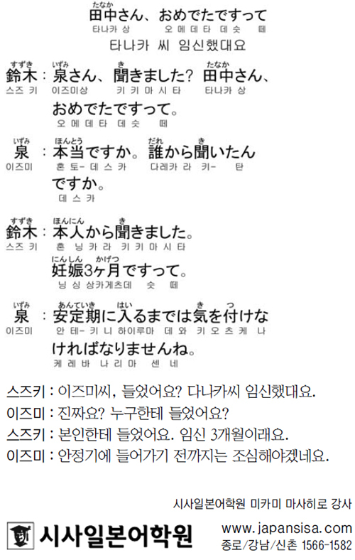 [시사일본어학원의 초단기 일본어 회화] 타나카 씨 임신했대요 입력 : 2017-08-29 09:00:00 수정 : 2017-08-28 21:10:43 구글 네이버 유튜브 Copyright ⓒ 세계일보. 무단 전재 및 재배포 금지 세계일보 조선미