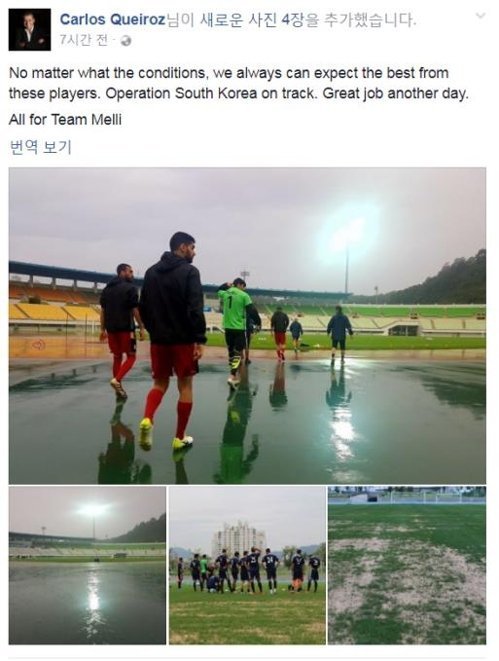 그가 올린 사진은 총 4장으로 훈련 첫날인 27일 흙바닥이 보이는 인천아시아드주경기장 보조경기장의 모습과 해당 경기장에서 몸을 푸는 이란 선수들의 모습, 둘째 날인 28일 비가 오는 파주스타디움의 전경과 이를 걷는 선수들의 모습을 게재했다.