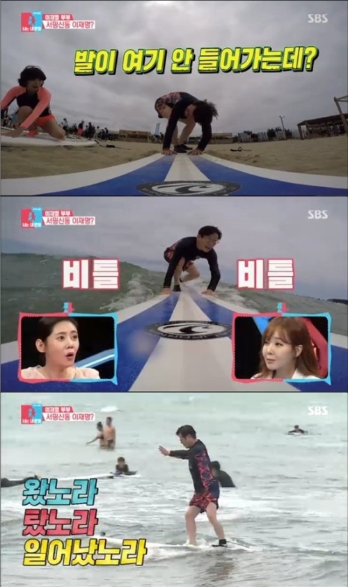 이재명은 일어서는 자세 자체가 잘 안되는 등 서핑에 어려움을 느꼈다.