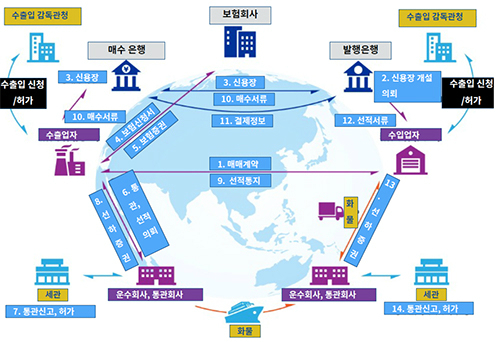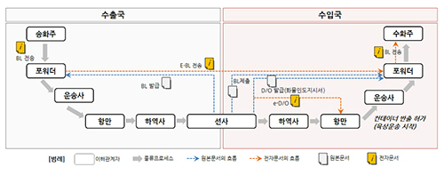 화물이 해상운송을 통해 화주로부터 고객에게 도착하기까지 위 그림과 같은 복잡한 절차를 거치게 된다. 물류 처리 과정을 살펴보면 송·수화주와 포워더, 선사, 운송사, 통관사, 은행 등 다양한 이해관계자가 존재함을 알 수 있다. 이 과정에서 선하증권과 신용장, 화물인도 지시서(D/O·Delivery of Order) 등 다양한 서류가 유통되는데, 여전히 그 원본(Paper)은 국제우편을 통해 전달되고 있다. 또한 물류 정보가 전산화되어 있지 않기 때문에 운송단계별 화물 상태를 확인할 수 없고 이로 인해 화물의 파손이나 손실이 발생했을 때도 책임소재를 명확히 가리기 어렵다. 그리고 다양한 이해관계자 간 계약을 보증하고 화물정보나 관련 서류를 공유하는데 많은 시간과 비용이 발생하고 있다.
