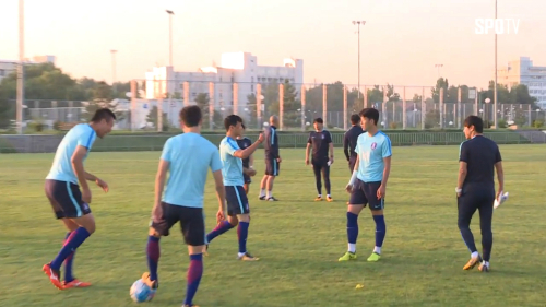 | 한국 축구 국가대표팀 선수들이 2018 러시아월드컵 아시아 최종예선 10차전 우즈베키스탄 원정 경기를 앞두고 지난 4일 화기애애한 분위기 속에 훈련을 하고 있다. 사진=스포티비 캡처 |