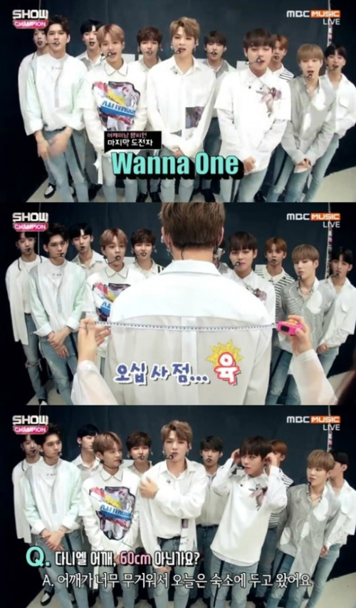 | 워너원 강다니엘(맨 아래 사진 가운데)이 6일 MBC뮤직 '쇼챔피언'에서 넓은 어깨를 자랑했다. 사진=MBC뮤직 캡처 |