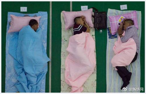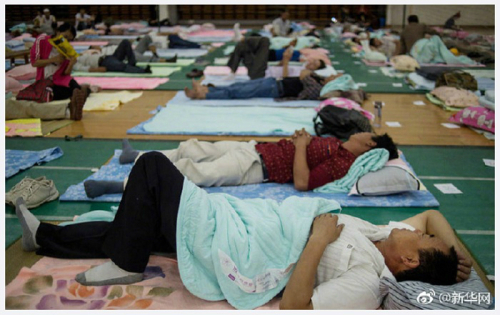 | 중국 후베이(湖北) 성 우한(武漢) 시에 있는 중남민족대학은 지난 16년 동안 지방에서 올라온 부모들이 입학 주간 이틀 동안 체육관에서 지낼 수 있게 배려해오고 있다. 신입생 자녀를 학교에 보낸 부모들이 대학 분위기도 살피고, 자식들과 떨어지기 전 마지막 위안이 되도록 이 같은 결정을 내렸다. 중국 웨이보 캡처. |