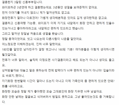 최근 국내 한 온라인 커뮤니티에는 '와이프 화장 전후가 너무 달라요'라는 다소 황당하지만 웃어 넘길 수 없는(?) 고민글이 올라왔다.