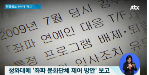 지난 11일 국정원 개혁위원회는 이외수, 조정래, 진중권, 문성근, 명계남, 김민선, 김미화, 김구라, 김제동, 윤도현, 신해철, 김장훈.이창동 박찬욱 봉준호 씨 등이 블랙리스트에 있다고 알렸다.
