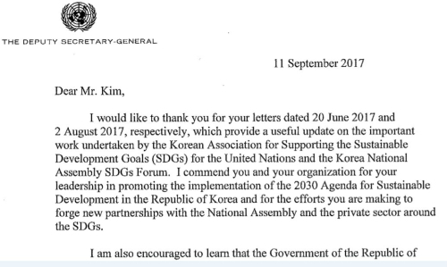 이번 공식 서신은 UN지원SDGs한국협회가 지난 6월20일과 8월2일 두차례 협회의 활동과 송옥주 더불어민주당 의원의 지속가능발전기본법 입법, 지속가능발전위원회 강화 계획을 비롯한 한국 정부의 활동 소식을 아미나 부총장에 보고한 데 따른 것이다.