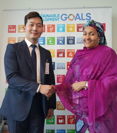 | 김정훈(왼쪽) UN지원SDGs한국협회 사무대표가 지난 8월 아미나 UN사무부총장에게 활동상황을 보고 한 뒤 함께 포즈를 취하고 있다. 사진=UN지원SDGs한국협회 제공 |