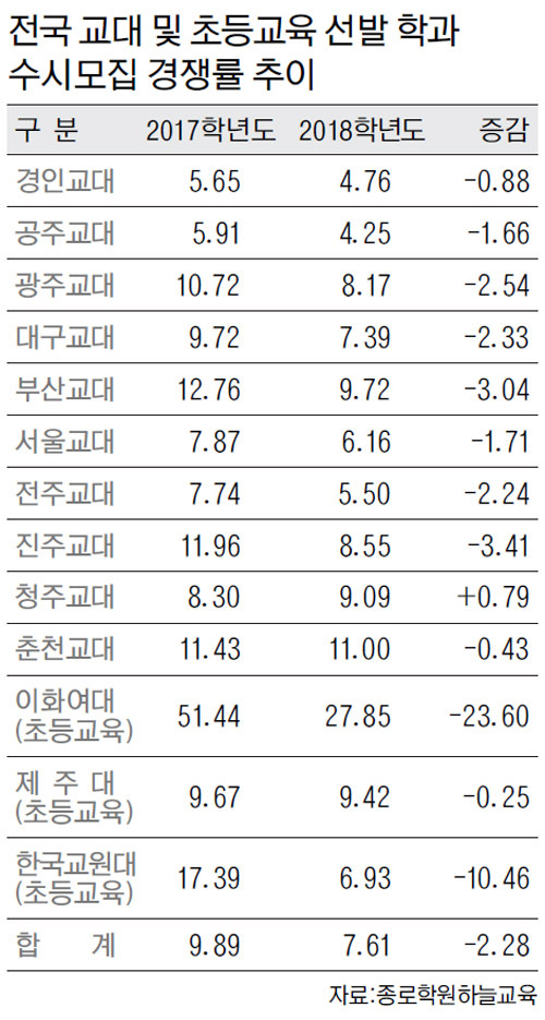 4년제 대학 초등교육과 지원율 하락폭은 더 심했다. 이화여대 초등교육과 경쟁률은 지난해 51.44대 1에서 올해 27.85대 1, 한국교원대(초등교육과)는 17.39대 1에서 6.93대 1을 기록했다. 임성호 종로학원하늘교육 대표는 “내년에도 교원 임용에 대한 비전이 제시되지 않는다면 교대 선호도는 더 추락할 것으로 예상한다”고 전망했다.